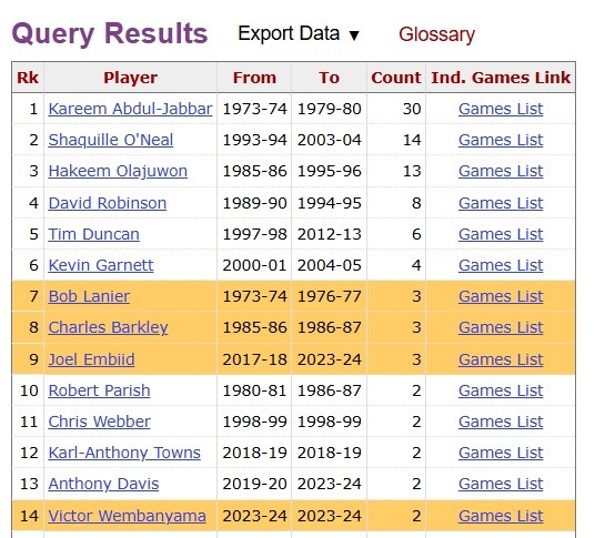 他單場得分25+籃板15+助攻5+蓋帽5+的場次(3場)已經來到NBA歷史第七。
