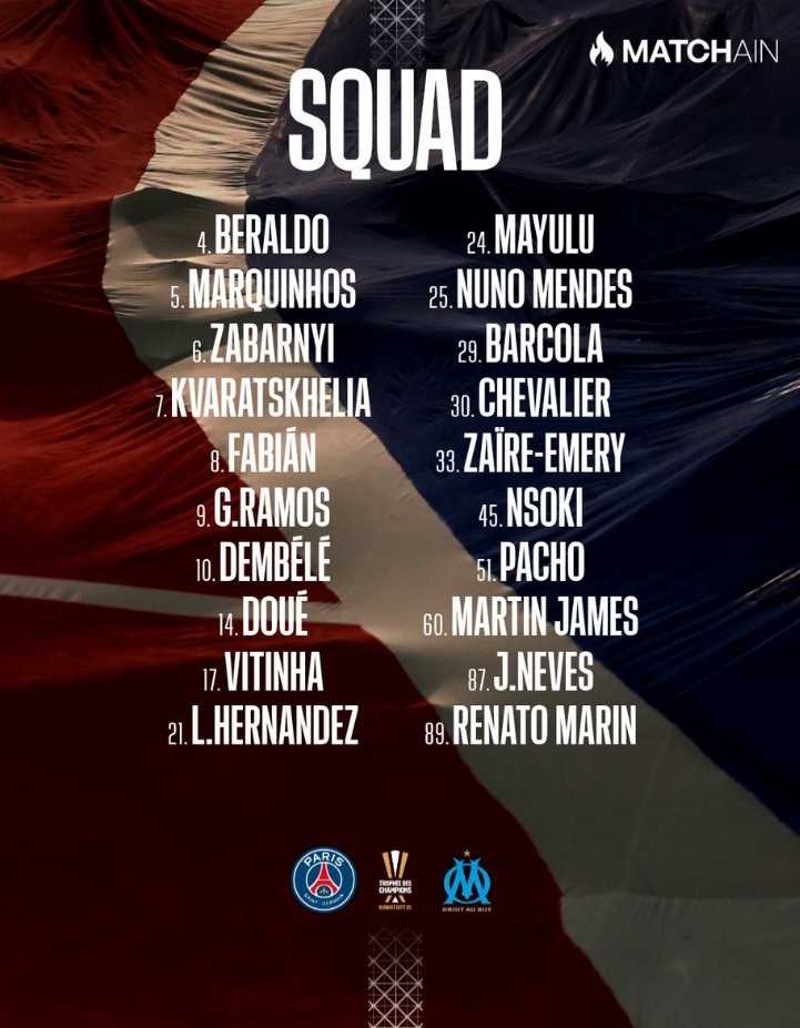 1月6日訊 巴黎將在法國(guó)超級(jí)杯決賽對(duì)陣馬賽,球隊(duì)也公布了本場(chǎng)比賽大名單,具體如下: