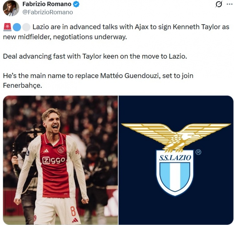 1月7日訊 據(jù)知名轉(zhuǎn)會(huì)記者羅馬諾報(bào)道,拉齊奧與阿賈克斯就中場肯尼思·泰勒交易進(jìn)行深入談判。