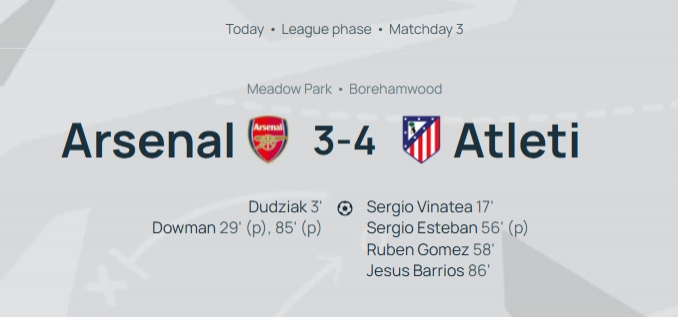 阿森納一度2-1領(lǐng)先直到下半場(chǎng),但馬競(jìng)青年軍在56-58分鐘時(shí)3分鐘內(nèi)連入兩球反超,道曼第85分鐘點(diǎn)射扳平后不到1分鐘,馬競(jìng)再度破門將比分鎖定為3-4。