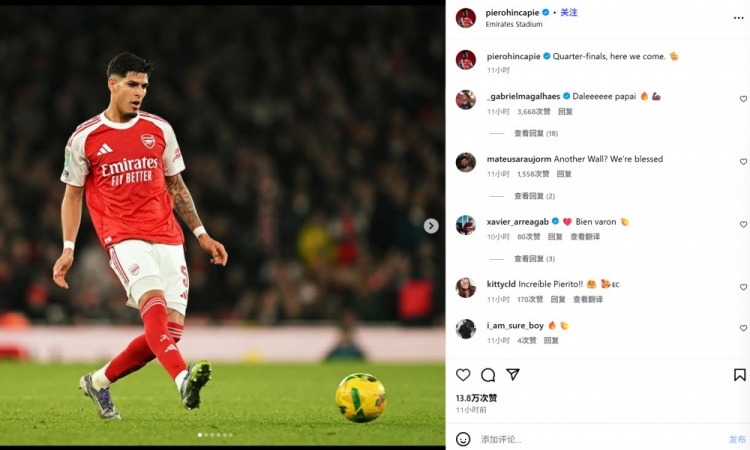他也在賽后通過社媒曬出自己的比賽照并配文:“八強戰(zhàn),我們來了!”隊友加布里埃爾也現(xiàn)身評論區(qū)鼓勵道:“加油!”