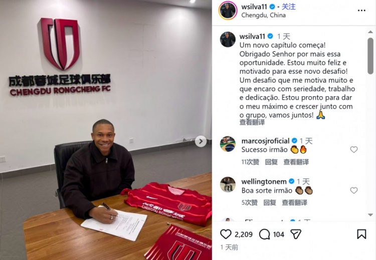 1月9日訊 成都蓉城簽下前海牛外援韋林頓·席爾瓦,球員更新社媒談到自己的感受。
