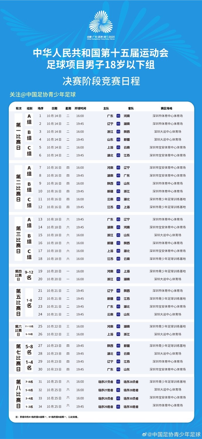 全運會U18男足決賽階段第六比賽日和第七比賽日對陣表
