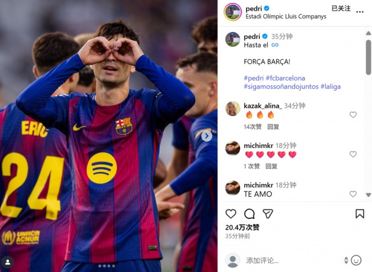 10月19日訊 在本輪西甲,巴薩2-1絕殺戰(zhàn)勝赫羅納。本場(chǎng)比賽佩德里打進(jìn)精彩進(jìn)球,賽后他也在社媒曬出慶祝進(jìn)球照片,配文寫道:“直到最后,加油巴薩!”
